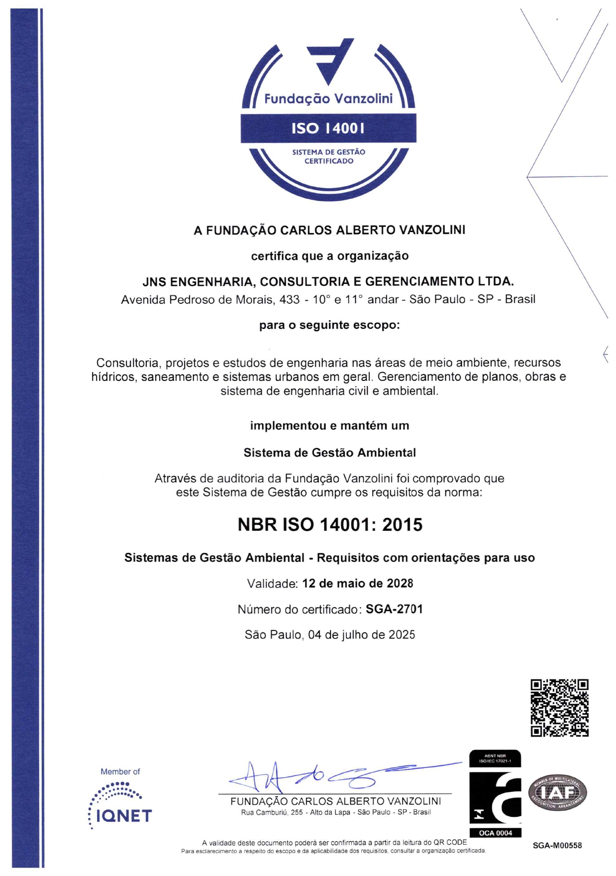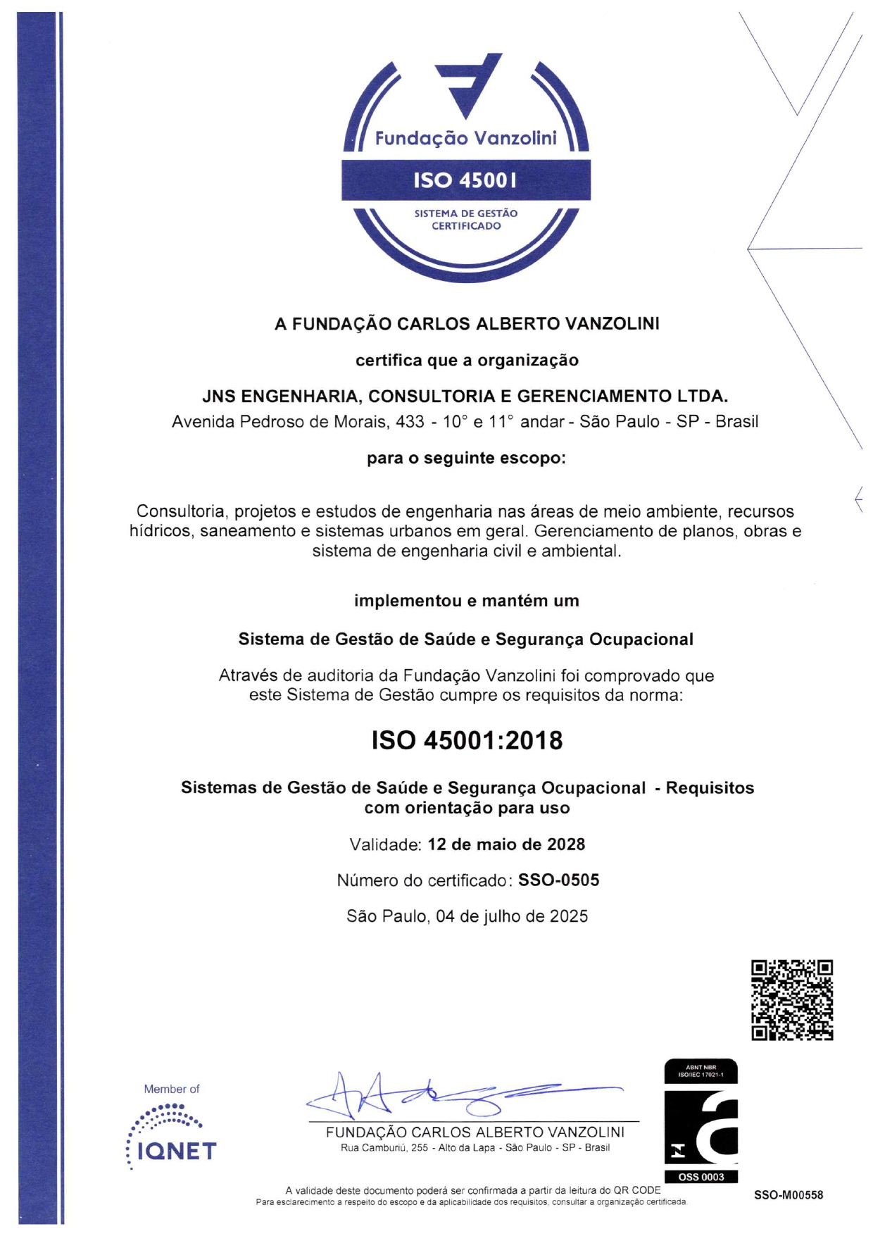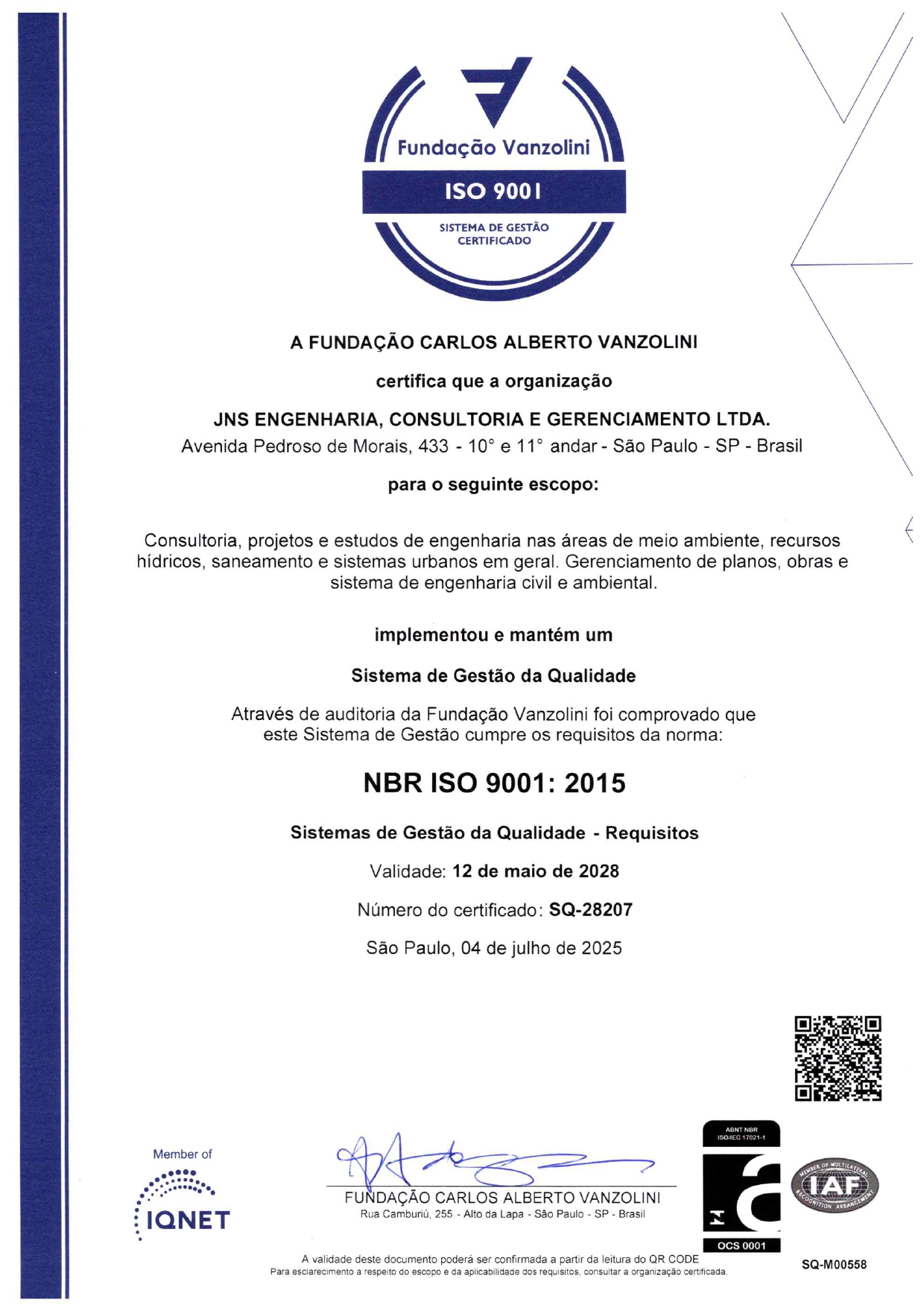 Faz parte da história da JNS uma busca permanente por desenvolvimento e aperfeiçoamento, o que naturalmente a levou ao envolvimento com a doutrina da QUALIDADE. Assim é que, ao final de 1997 deu início ao processo de certificação em um plano setorial, o PSQ/QUALIHAB, voltado à atividade de Gerenciamento. A certificação com base na norma ISO 9001 ocorreu em Janeiro de 2001, incorporando as normas de Meio Ambiente, Segurança e Saúde Ocupacional em Novembro de 2016, zelando pela saúde e bem estar de nossos colaboradores e contribuindo para prevenção do Meio Ambiente.